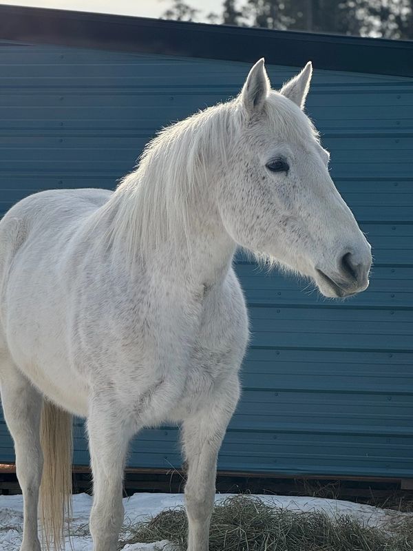 Piper is a white mare with subtle brown spotting, born the spring of 2010.